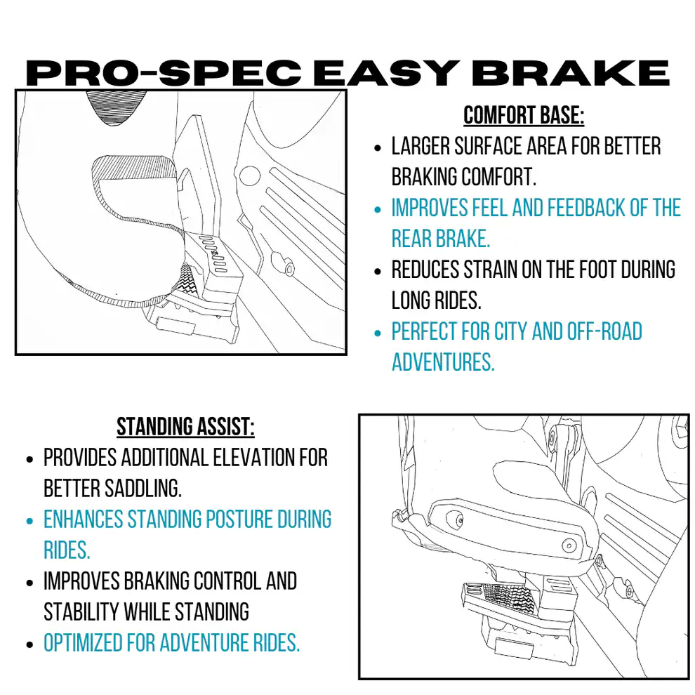 The Easy Brake from Pro-Spec Performance Parts is designed to enhance your riding experience. It provides a larger surface area for improved braking comfort and includes a standing assist feature that offers extra elevation while saddling. This enhances brake feedback and makes both adventure rides and daily commutes smoother and easier.