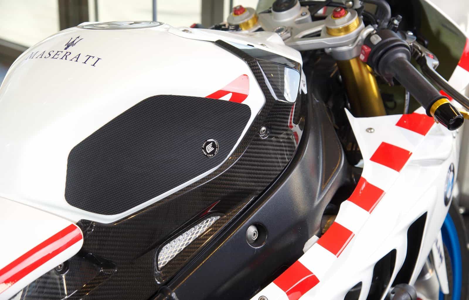 Eazi-Grip’s Pro tank grips for the BMW S1000RR (2015-2018) feature a tightly-packed circular embossed pattern that offers excellent grip under acceleration, braking and cornering. Constructed of durable UV-resistant polyurethane, this kit is tailored to the tank shape of the S1000RR for a clean, precision fit. It also helps reduce vibration transmitted through the rider’s knees, contributing to a more comfortable and confident ride.