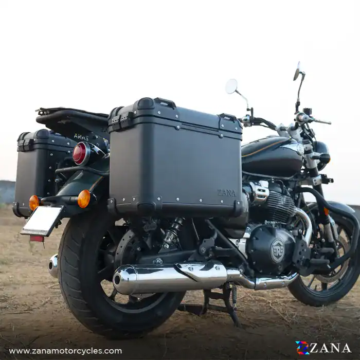 Enhance your Super Meteor 650’s storage with ZANA’s 36-liter aluminium R-Flat Black Panniers, expertly designed for durability, style, and functionality. These premium-quality side panniers, crafted from high-grade aluminum and stainless steel, offer a rust-free, waterproof construction that withstands rugged conditions while securing your belongings. Equipped with water-locking gaskets and overflow drainage, they provide comprehensive protection against moisture, ensuring your items stay dry in various weather conditions.