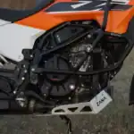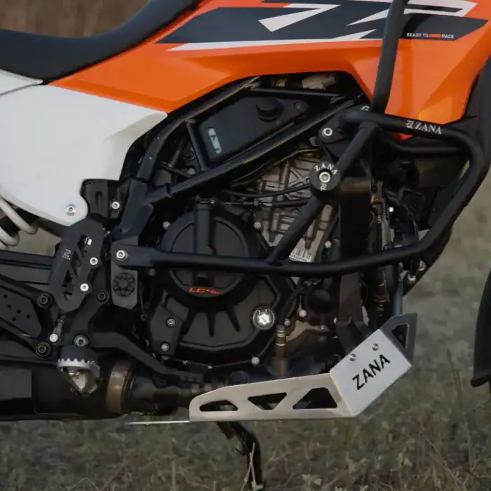 Take your crash protection up a notch with Zana’s aluminum sump guard, offering additional safety for the lower engine. The crash bars are built with ample clearance around the KTM’s fairing and engine to absorb and distribute impact effectively at low speeds.