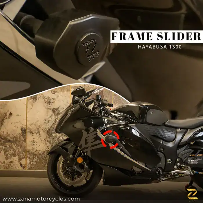 Tags: Suzuki Hayabusa 1300 frame slider, black frame slider for Hayabusa, Type-2 frame slider, motorcycle crash protection, Hayabusa accessories, durable frame slider, impact-resistant bike slider, stylish motorcycle protection, Hayabusa safety gear, Suzuki motorcycle parts.