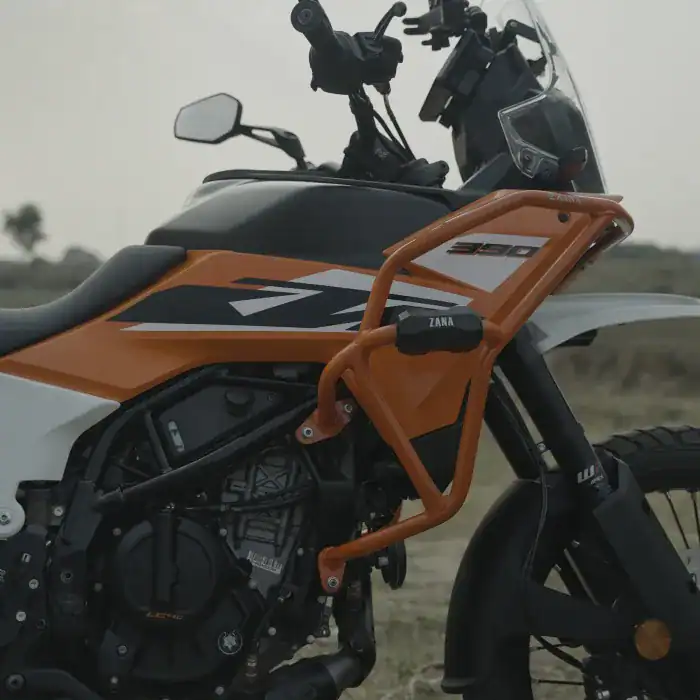 Tank Guard with Slider Puck Orange for KTM ADV 390 2025 is designed to provide exceptional protection for your fuel tank, engine casing, and radiator. Built to withstand impact, this heavy-duty tank guard ensures your adventure bike remains secure in case of a fall while enhancing its rugged appeal.