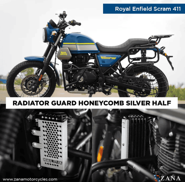 This Honeycomb Radiator Guard for Royal Enfield Himalayan and Scram 411 is crafted from 100% aluminum for excellent heat dissipation and enhanced cooling. It effectively shields the oil cooler from mud, debris, and slush, preventing choking during challenging terrains. Designed with a universally accepted honeycomb mesh and powder-coated finish, it provides durability and long-term weather resistance. The guard ensures optimal protection without restricting airflow, making it ideal for touring and off-road use.