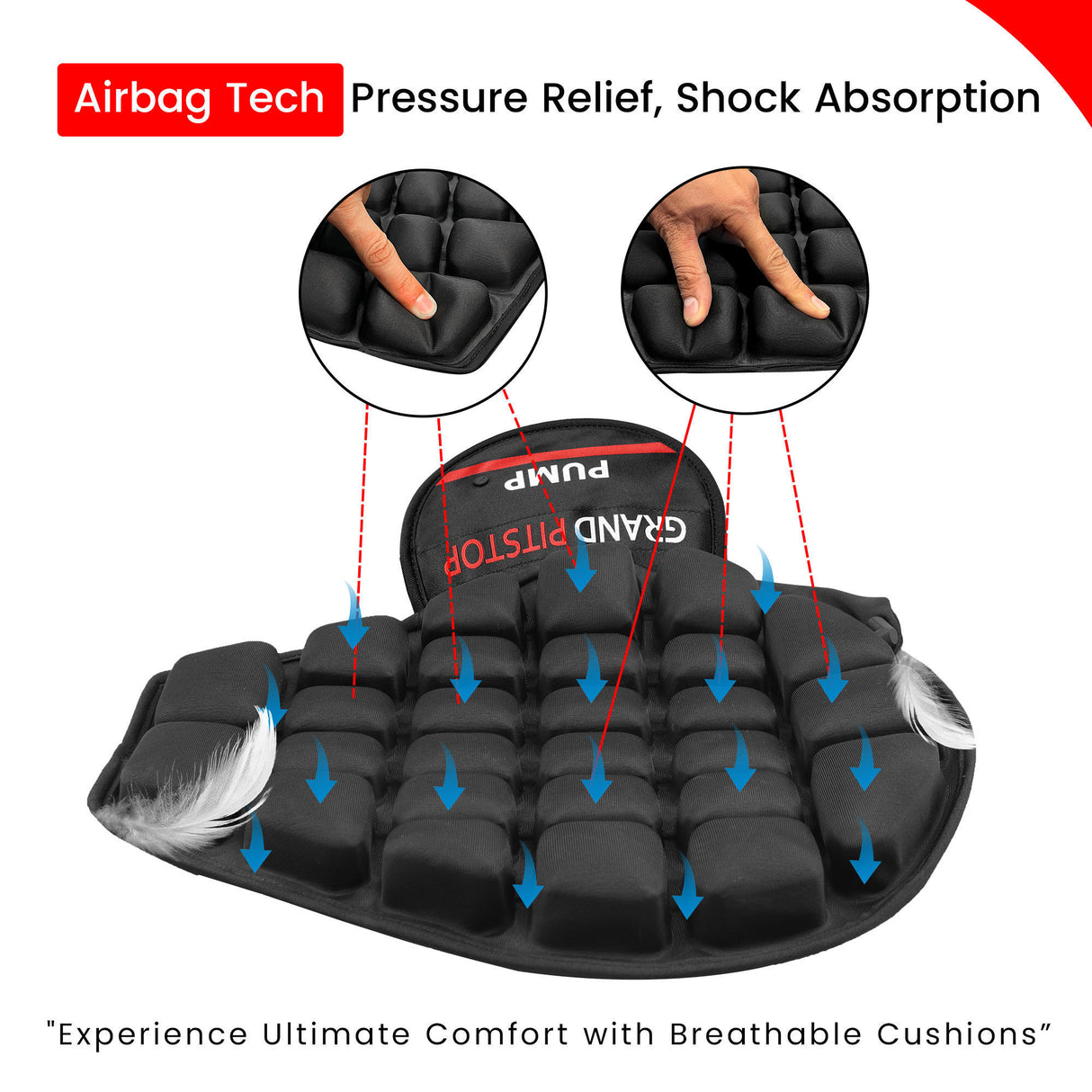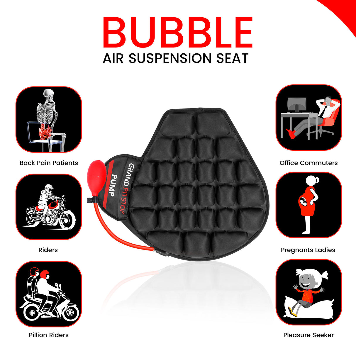 Experience immediate relief from back pain, tailbone strain, and stiffness—whether you’re working at your desk, driving long distances, or riding your motorcycle. The Air Bubble Airseat enhances posture, boosts comfort, and keeps you energized throughout the day. Its adaptive air-cell design ensures a smoother, shock-absorbing ride and minimizes fatigue, making it a perfect companion for individuals who demand both comfort and mobility.