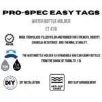 Whether you’re on a city ride or exploring rugged trails, hydration is key. The Easy Tag Bottle Holder (ET 470 BM) from Pro-Spec is designed to keep your water within easy reach, so you can focus on the ride, not on stopping.